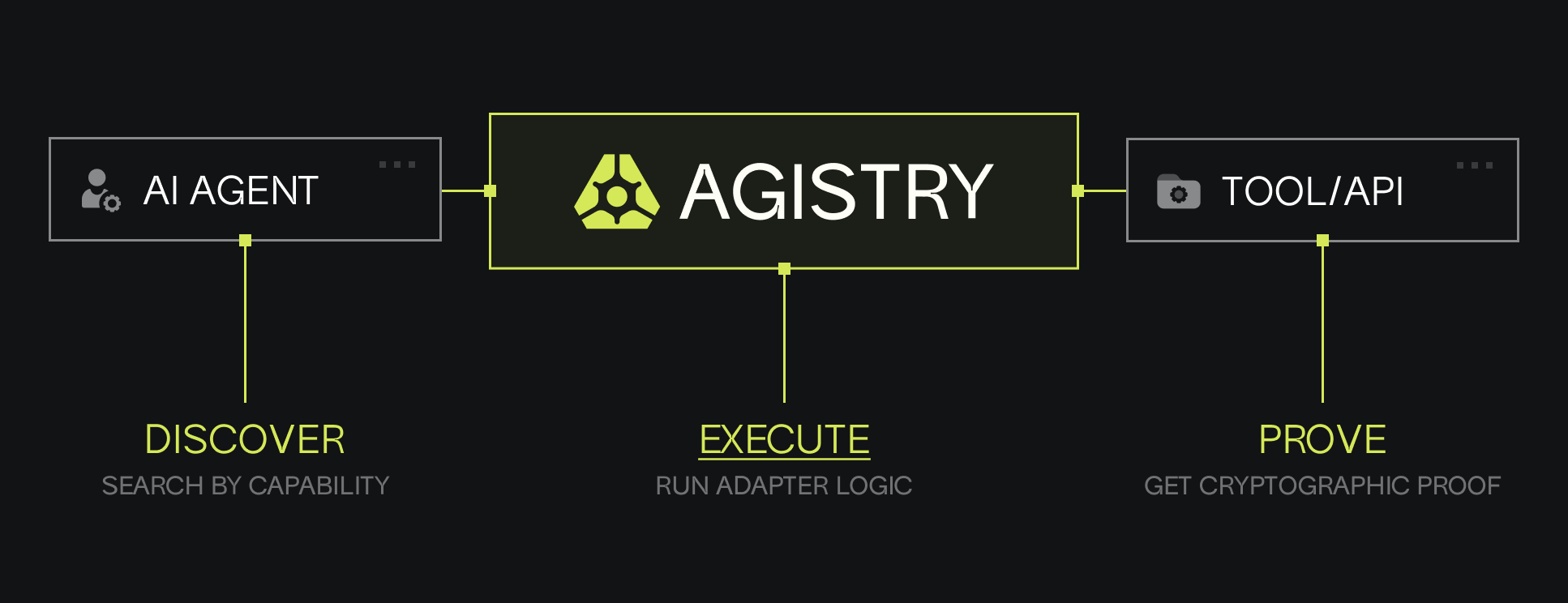 <figure><img src="https://4059554020-files.gitbook.io/~/files/v0/b/gitbook-x-prod.appspot.com/o/spaces%2FwMVOvy6A425WZ7vVWOKW%2Fuploads%2FDaXlBBdOUA6GOsYFYXms%2Fschita.png?alt=media&#x26;token=b348d768-981c-4908-b33c-afc32e4b2e2e" alt=""><figcaption><p>figure 1.1 - With Agistry, agents can discover standardized adapters based on capabilities, execute actions through shared logic, and receive cryptographic proof of execution. This modular system enables scalable, composable, and trustless interactions between AI agents and external tools, no custom scripts required.</p></figcaption></figure>