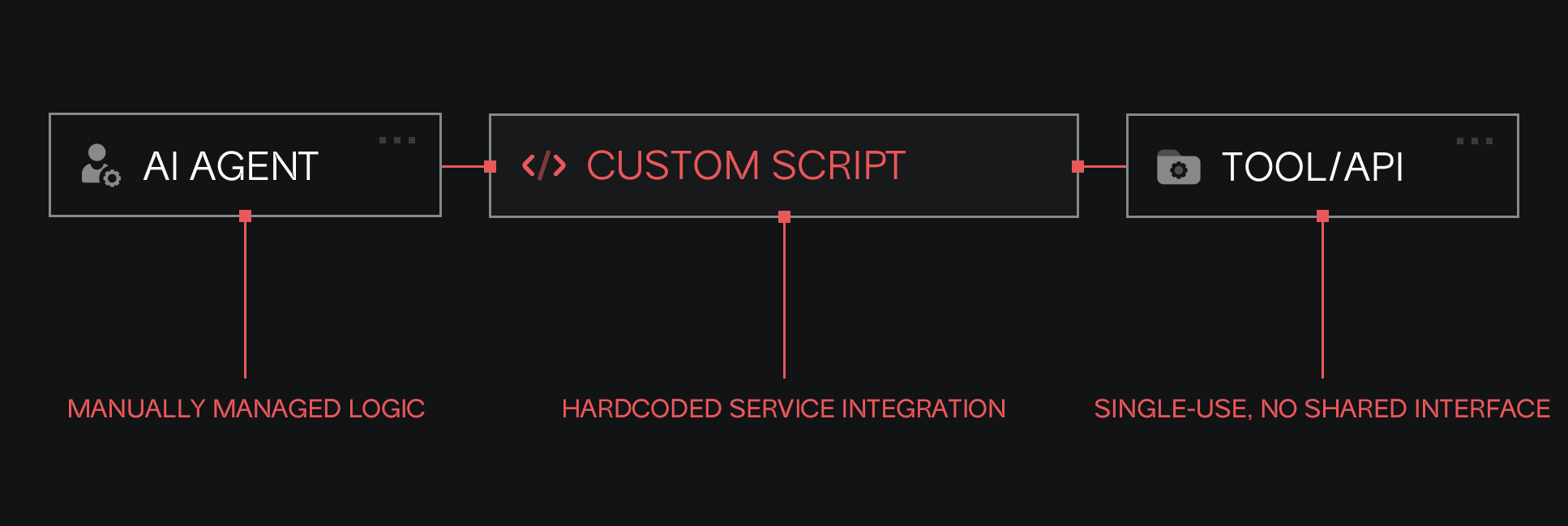 <figure><img src="https://4059554020-files.gitbook.io/~/files/v0/b/gitbook-x-prod.appspot.com/o/spaces%2FwMVOvy6A425WZ7vVWOKW%2Fuploads%2FvsOItbquFHhBhHWWG8l5%2Ff1.png?alt=media&#x26;token=f2583fd5-cd3b-46d6-95e1-9b82be2c4332" alt=""><figcaption><p>figure 1.0 - Traditional way. Agents require custom scripts to interact with each service individually. Each connection is hardcoded, non-standard, and lacks composability, making it difficult to scale or reuse logic across tools</p></figcaption></figure>